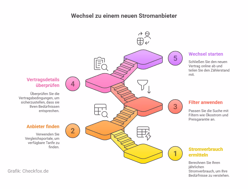 Ein Stromvergleich ist unkomplizierter, als viele Menschen denken. Mit den nachfolgenden fünf Schritten erhalten Sie schnell Klarheit über mögliche Einsparungen und finden den passenden Tarif für Ihre individuelle Lebenssituation.