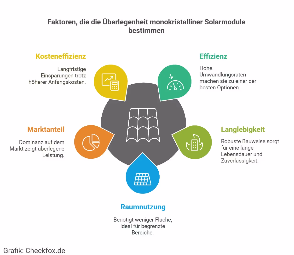 Der Einsatz von monokristallinen Modulen im Eigenheim reduziert nicht nur die Stromrechnung, sondern steigert auch den Immobilienwert. Mit den steigenden Energiepreisen und einem wachsenden Umweltbewusstsein erweist sich eine Photovoltaikanlage als zukunftsorientierte Investition. Diese Module bieten eine langfristig zuverlässige und wartungsarme Energiequelle, die sich finanziell lohnt.