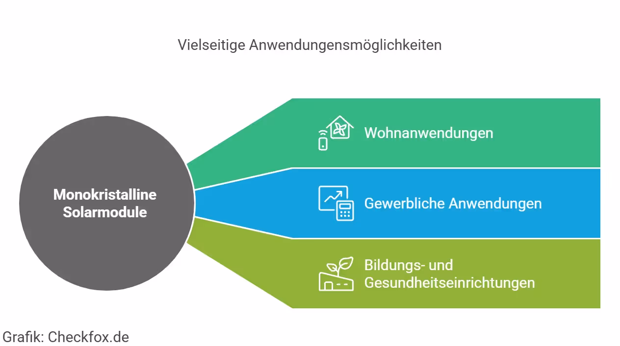 In der modernen Solarenergiebranche sind monokristalline Module wegen ihrer Vielseitigkeit und Effizienz besonders wertvoll. Ihr Einsatz im Eigenheim ist aufgrund der optimalen Energieerträge auch bei knappem Platzangebot beliebt. Diese Module finden ihren Einsatz in einer breiten Palette von Anwendungen, von kleinen Privathäusern bis hin zu großen Photovoltaikanlagen.