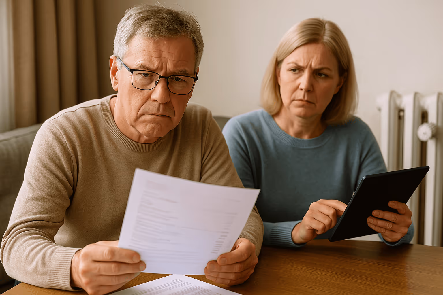<p>Hero-Image-Prompt: Editorial-Stil, typischer Hausbesitzer (ca. 60 Jahre) sitzt am Wohnzimmertisch, blickt sorgenvoll auf eine extrem hohe Heizkostenabrechnung, Ehepartnerin im Hintergrund schaut auf Tablet, politisch wirkendes Portrait, redaktioneller Look. 1067×600px</p>