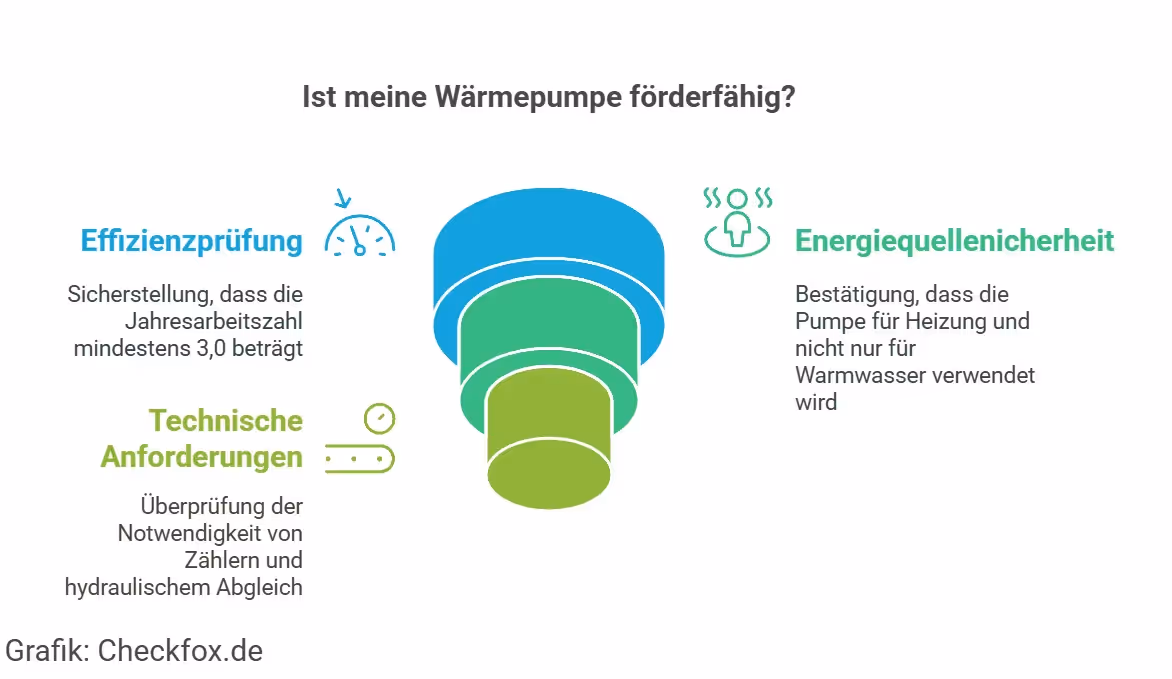 Wichtig sind Mindestanforderungen an die Wärmepumpe, eine Fachunternehmererklärung und bestimmte Gebäudeanforderungen. Der Antrag muss vor Beginn des Vorhabens gestellt werden.