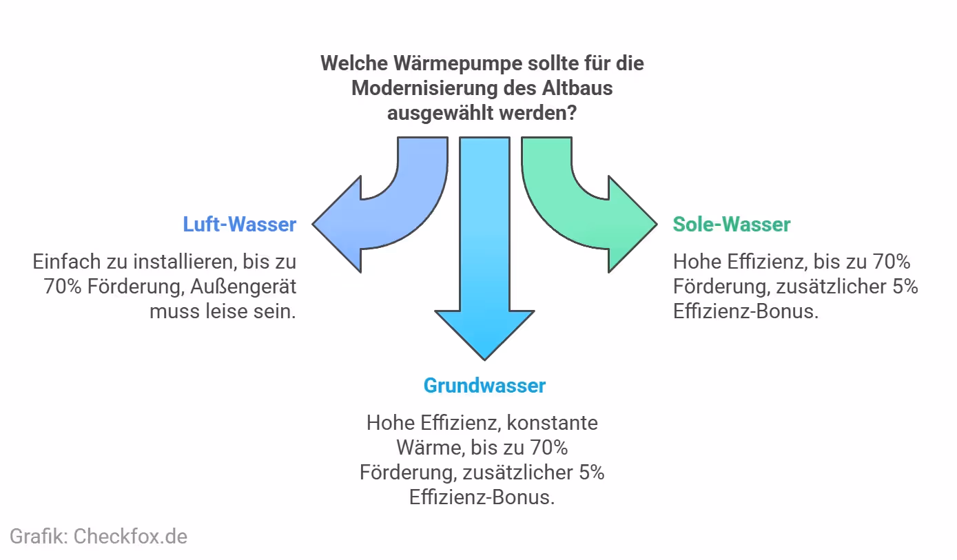 Für Altbauten eignen sich Luft-Wasser-Wärmepumpen besonders gut, da sie vergleichsweise einfach zu installieren sind und keine aufwendigen Erdarbeiten erfordern. Sie bieten ein gutes Verhältnis von Kosten zu Nutzen. Sole-Wasser- und Wasser-Wasser-Wärmepumpen können in bestimmten Fällen auch geeignet sein, erfordern aber meist einen höheren Installationsaufwand.