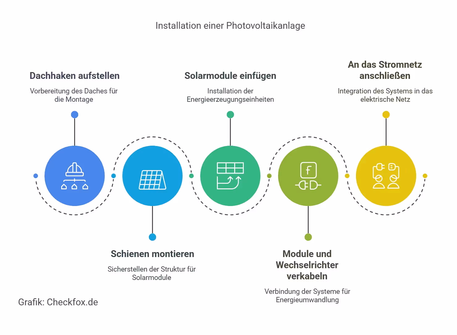 Planen Sie die Installation mit Ihrem Anbieter. Die Montage benötigt meist 1 bis 3 Tage. Nach der Inbetriebnahme melden Sie die Anlage beim Netzbetreiber an. Die Einspeisevergütung liegt derzeit bei 7,94 Cent pro kWh.