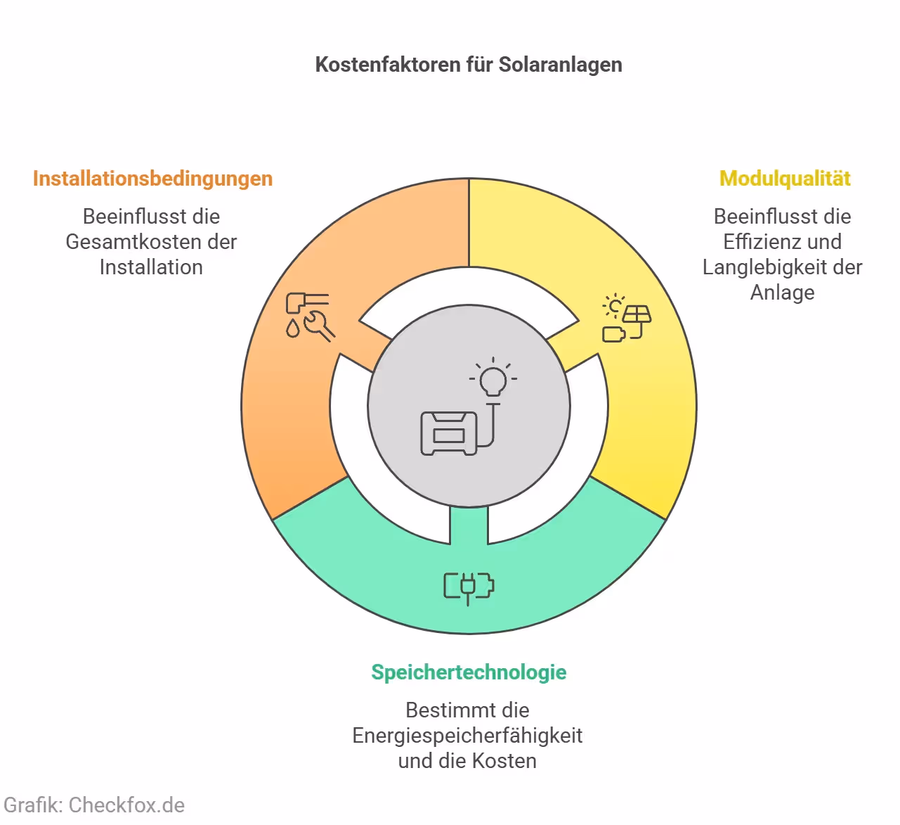 Der Preis wird durch die Qualität und den Typ der Solarmodule, die Speicherkapazität und -technologie sowie die Installationsbedingungen beeinflusst. Auch Dachbeschaffenheit, Installationsschwierigkeiten und regionale Preise spielen eine Rolle.