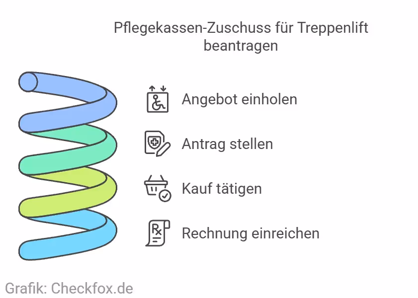 Pflegegrad prüfen: Falls noch nicht vorhanden, Pflegegrad bei der Pflegekasse beantragen. Kostenvoranschläge einholen: Mindestens drei Angebote von Treppenlift-Anbietern vergleichen. Antrag ausfüllen: Entweder mit dem Formular der Pflegekasse oder formlos. Wichtige Unterlagen beifügen: Ärztliches Attest, das die Notwendigkeit bestätigt, detaillierter Kostenvoranschlag, falls vorhanden: Fotos der aktuellen Wohnsituation. Antrag einreichen: Entweder per Post oder online direkt bei der Pflegekasse.