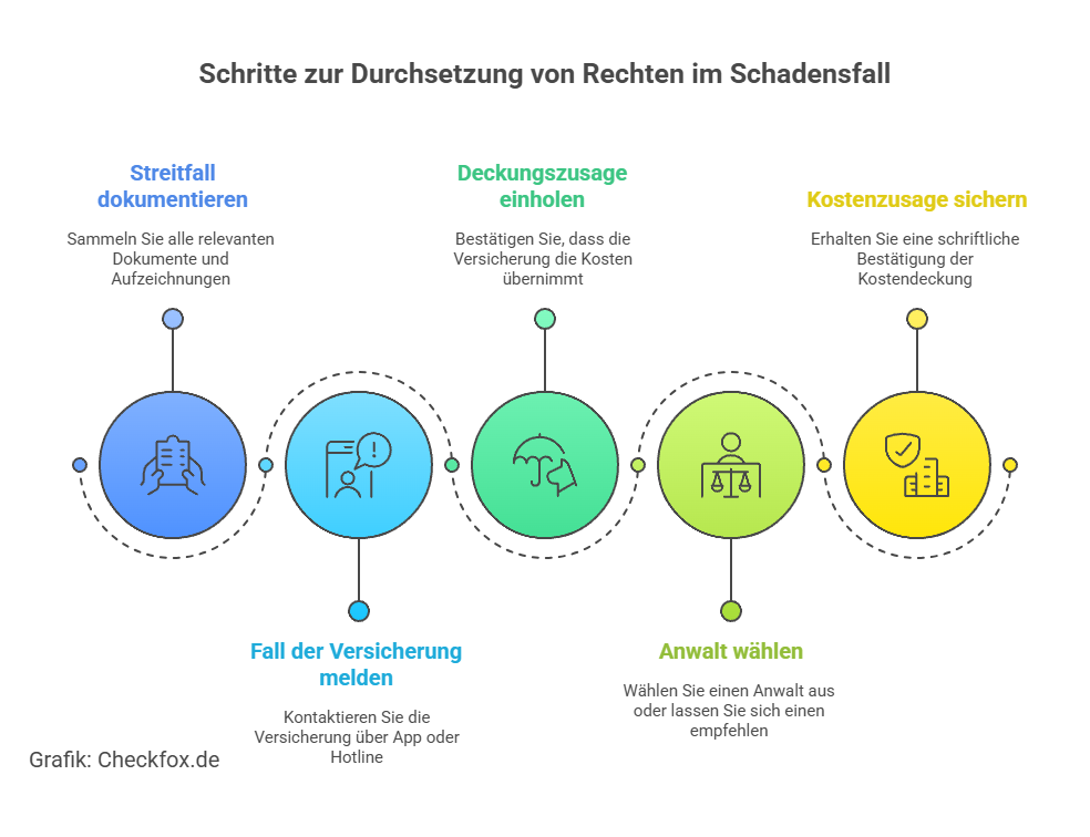 - Kostenabrechnung: Der Anwalt rechnet direkt mit der Versicherung ab – nur die Selbstbeteiligung (falls vorhanden) zahlen Sie selbst.